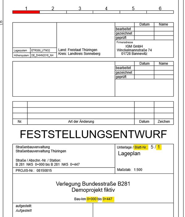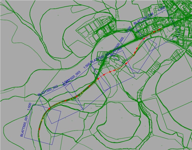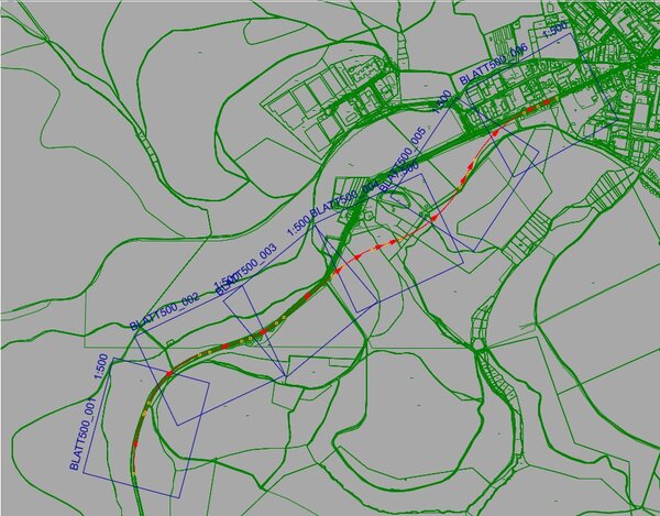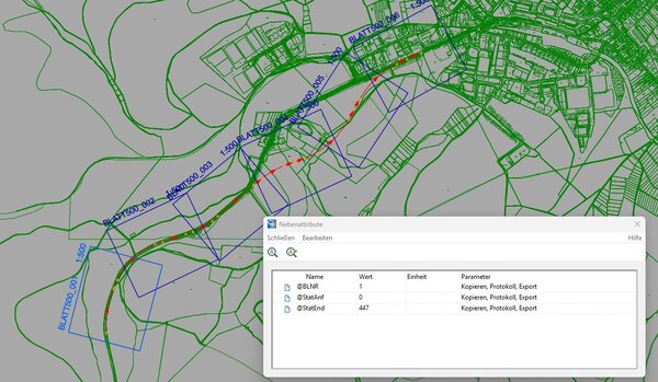 Die erzeugten Blattschnitte erhalten automatisch ausgefüllte Nebenattribute für die Blattnummer (BLNR) und den abgebildeten Stationsbereich (StatAnf und StatEnd). In den im Regelwerk RE2012 mitgelieferten Stempelfeldern sind bereits Textvariablen mit den gleichen Namen enthalten und werden auf diese Weise beim Erzeugen der Zeichnung direkt übernommen.