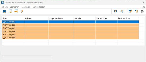 Beim Anlegen der Blattschnitte wird gleichzeitig eine Stapelliste erzeugt und sofort zur Bearbeitung geöffnet. Hier können nun bereits die Namen der zu erzeugenden Zeichnungen eingetragen werden. Auch das Zuordnen der Plotvereinbarungen und die Schichtauswahl ist über den Menüpunkt „Sammeldaten“ möglich.