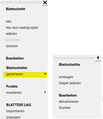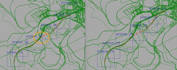 Standardmäßig werden die Blattschnitte so erzeugt, dass sie an der Achse ausgerichtet sind. Alternativ können Blattschnitte auch ungedreht mit einem Winkel von 100 Gon (Nordausrichtung) erzeugt werden. Der Abstand der Blattschnitte zueinander kann mit der Überlappung beeinflusst werden.