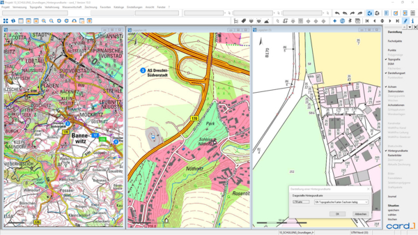 Die Funktion Hintergrundkarte ergänzt die Rasterbildfunktionen in card_1, ersetzt diese aber nicht. Wenn Sie Zeichnungen mit Rasterbildern hinterlegen wollen, ist es weiterhin notwendig, die Daten von dem WMS-Server herunterzuladen, um in card_1 in gewohnter Weise mit RAL-Dateien und RAZ-Dateien weiter arbeiten zu können.