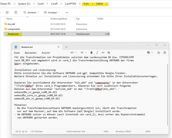 Diese Transformationslösung nutzt das Transformationsprogramm GNTRANS der Firma Geo++, das von der DB autorisiert wurde. Diese Software muss erworben und auf dem Rechner installiert werden. Anschließend können ausgewählte DLL-Dateien in den TRAFO-Ordner des card_1 Programmordner kopiert werden. Nähere Informationen dazu findet man in der Readme.TXT im \TRAFO\DBREF-Ordner.