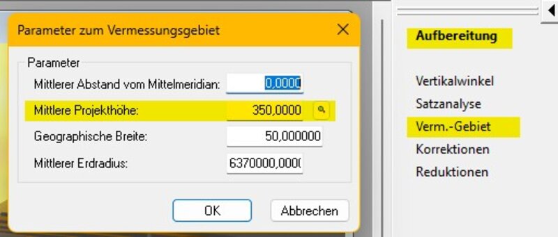 Für Daten, für die keine Höhen vorliegen (Punkte, Symbole, Texte usw.), muss der Anwender eine mittlere Projekthöhe festlegen. Diese stellt man unter „Einstellungen -Vermessungseinstellungen bearbeiten – Aufbereitung – Vermessungsgebiet“ ein.