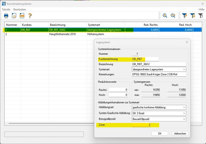Für die Transformation mit diesem System muss in der card_1 Koordinatensystemverwaltung ein Lagesystem für DB_REF eingetragen sein. In der Kurzbezeichnung muss zwingend 'DB_REF' stehen.