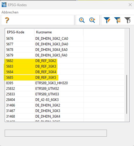 Das DB_REF ist in Deutschland in den Zonen 2, 3, 4 und 5 verfügbar. Zum Anlegen des Koordinatensystems können Sie über die Funktion „Bearbeiten – Lagesystem eingeben (EPSG)“ eine der 4 Zonen auswählen.
