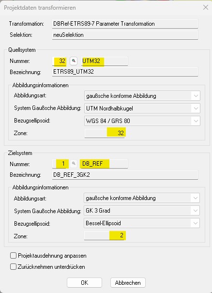 Wird diese Einstellung ignoriert, verursacht beispielsweise ein Höhenfehler von 50 m im Quellsystem eine systematische Lageabweichungen von 1 mm im Zielsystem, bei einer tatsächlichen mittleren Projekthöhe von 200 m ergibt sich demzufolge ein Lagefehler von 4 mm. Ein Hinweis dazu findet sich in der Hilfe.